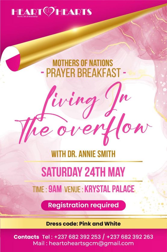 Join us for a special event! Heart to Hearts brings to you a Mothers of Nations Prayer Breakfast with Dr. Annie Smith, this Saturday at Krystal Palace, Akwa Douala. Theme: Living in the Overflow. Get prepared to have blissful moments of Communion with the Eternal Word, Jesus Christ. Time: 9 a.m. GMT+1 N.B: Registration is required. Contact our Resource Centre, Eikon Service Center through the following numbers: 682 392 253 / 682 392 263 __________________ Un événement spécial nous attend ! Ce samedi à l'hôtel Krystal Palace Douala, Heart to Hearts organise un petit-déjeuner de prière pour le compte de Mothers of Nations, avec le Dr Annie Smith. Thème : Vivre dans le débordement. Préparez-vous à passer des moments bénis de Communion avec Jésus-Christ, la Parole Éternelle. Heure : 9h GMT+1 N.B: Pour y prendre part, vous devez vous inscrire à notre Centre de resources, Eikon Service Center, aux numéros suivants : 682 392 253 / 682 392 263